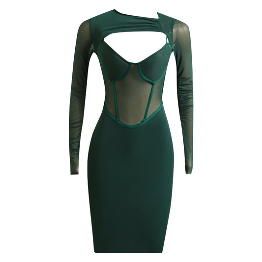 Mesh See-through Sexy Long Sleeve Dress Hollow-out Tight Bandage Dress