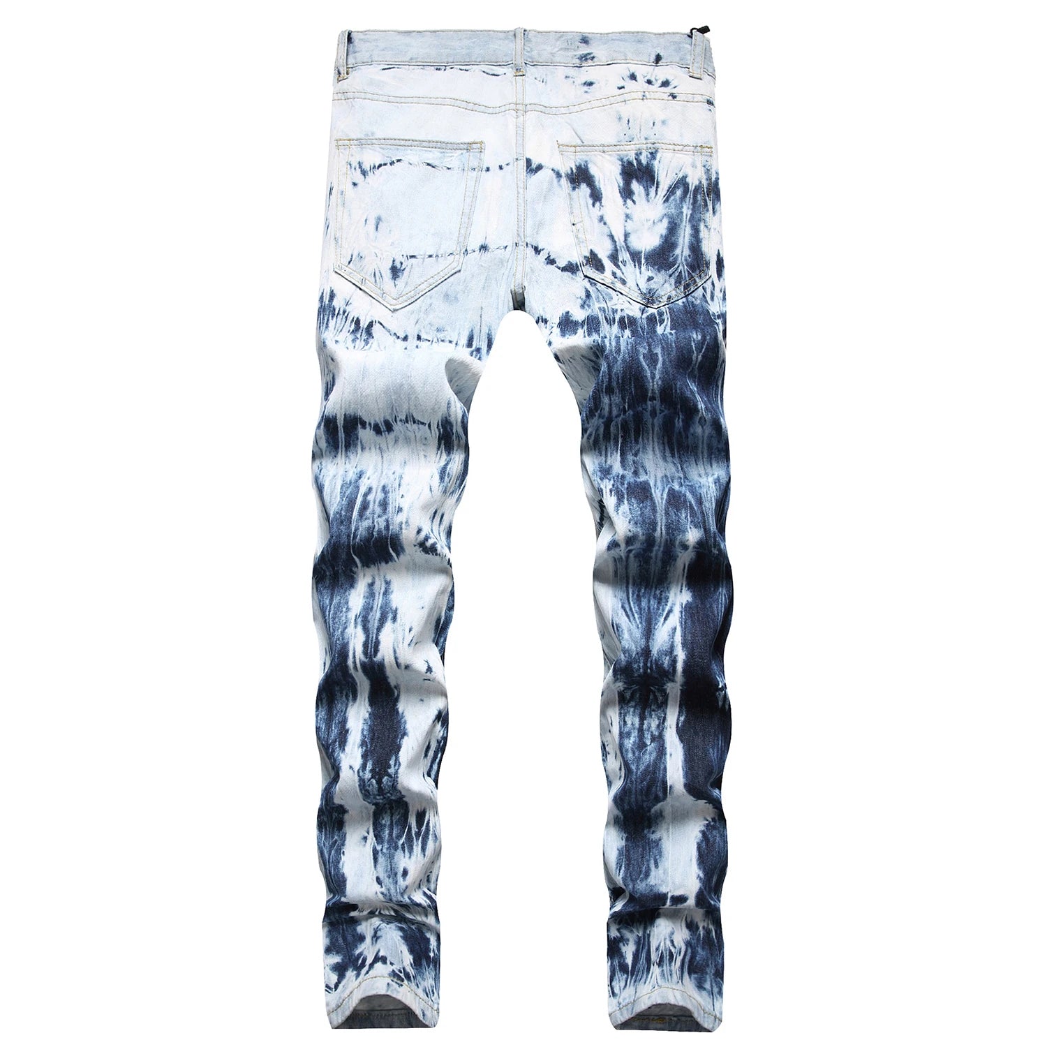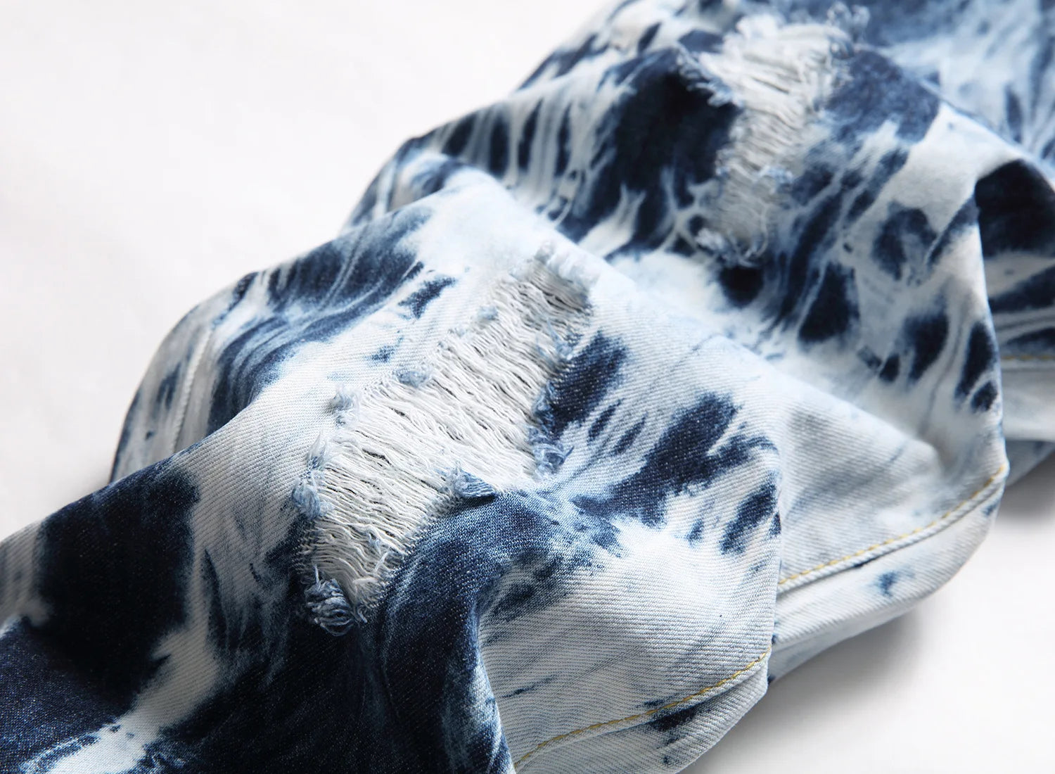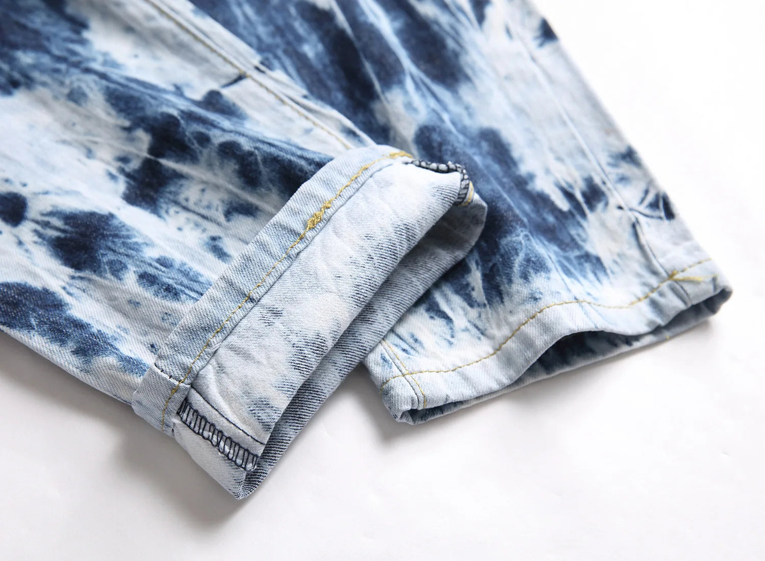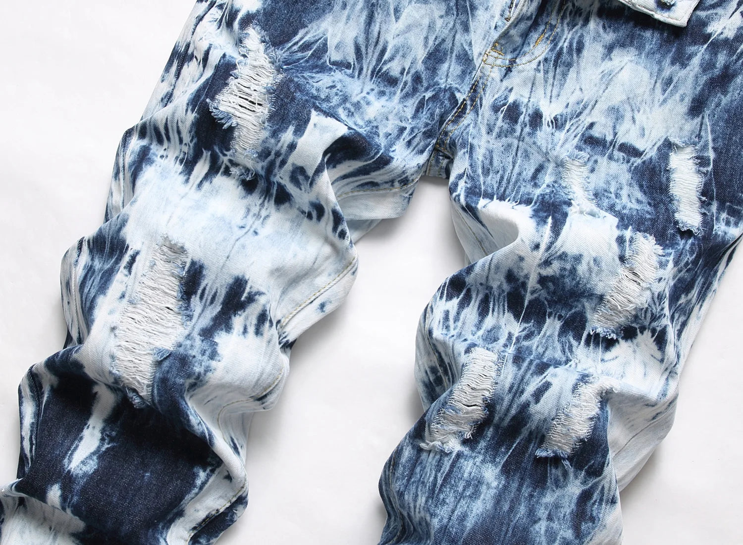 Men’s High Quality Tie-dyed Blue Jeans Slim-fit Ripped Jeans