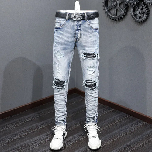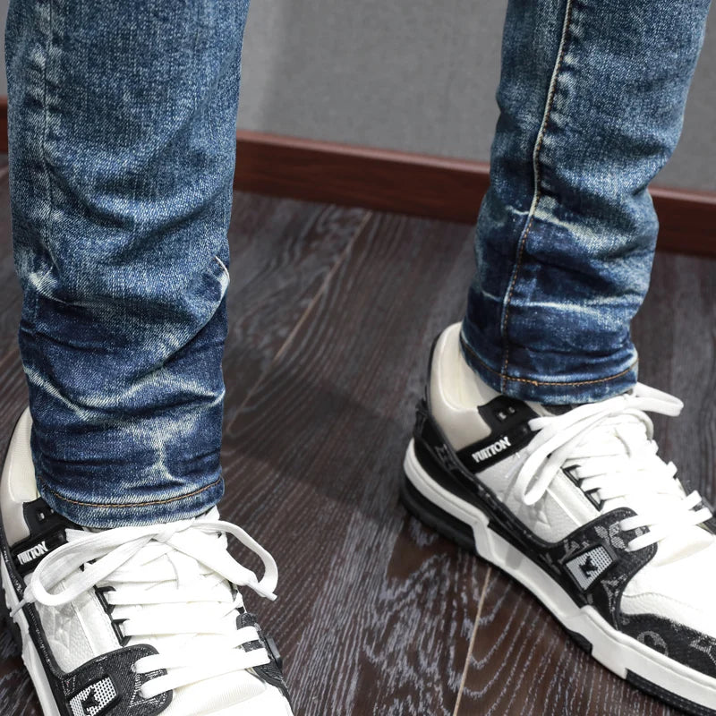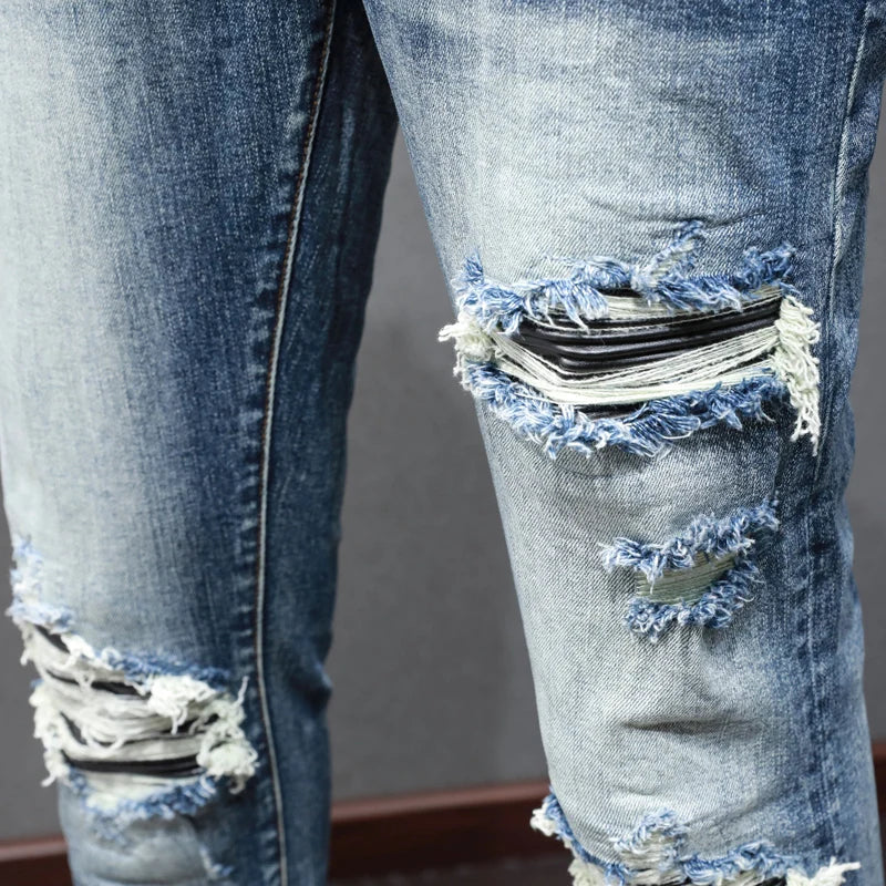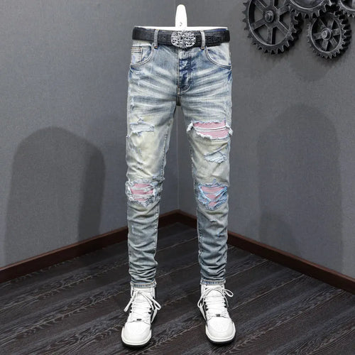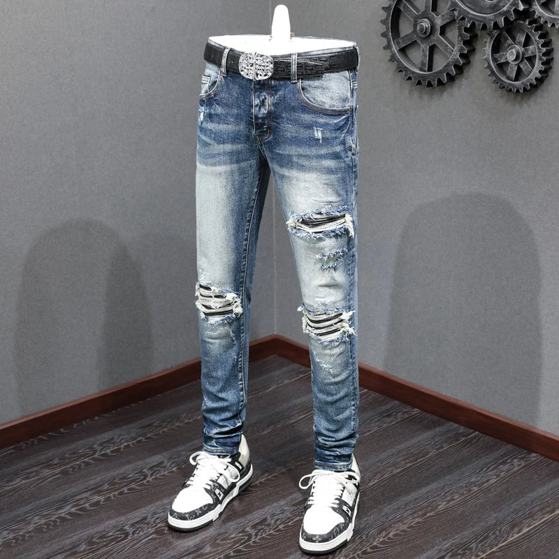 Street Fashion Men Retro Blue Stretch Skinny Ripped Denim Jeans